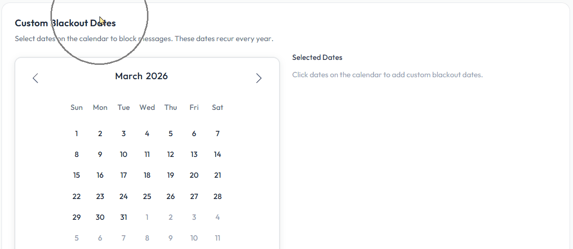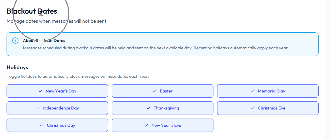 β οΈ Note: Messages scheduled during blackout dates will be held and sent on the next available day. Recurring holidays automatically apply each year.