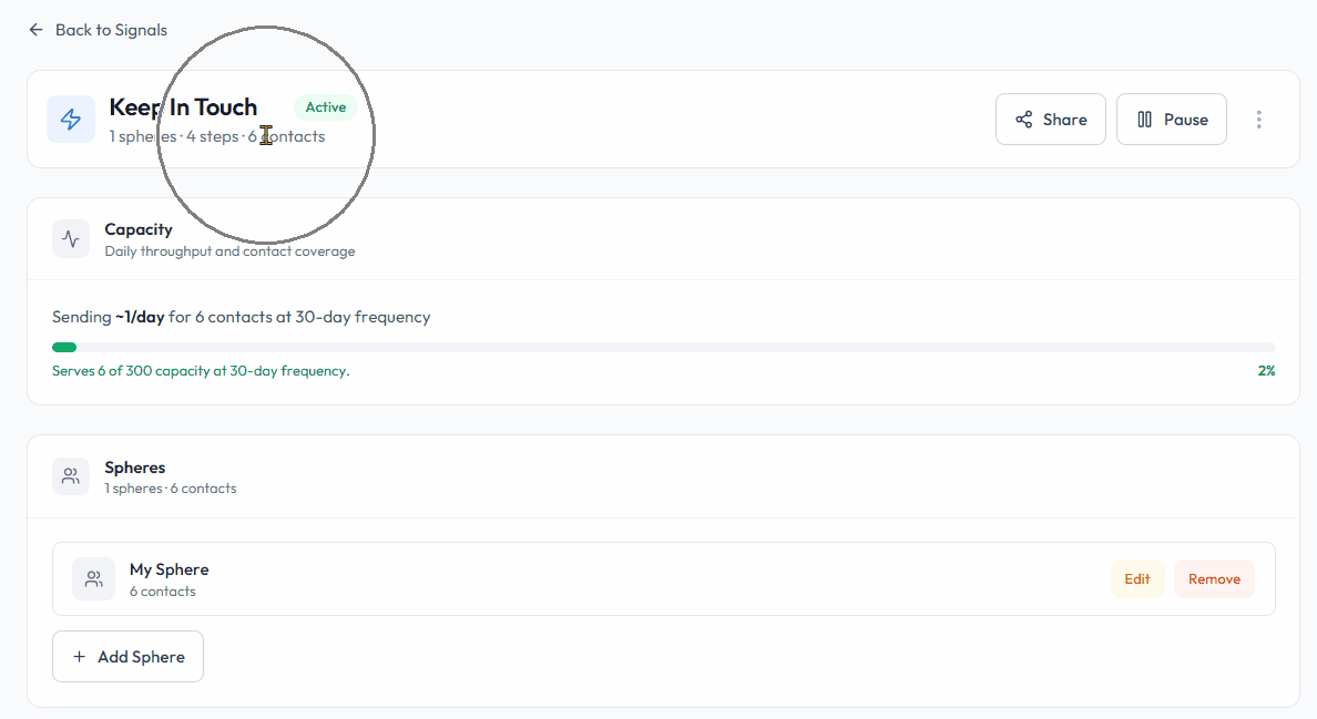 To get started with Blutext right after importing your Contacts into Spheres, we’ve included the ready-to-use “Keep in Touch” Signal.