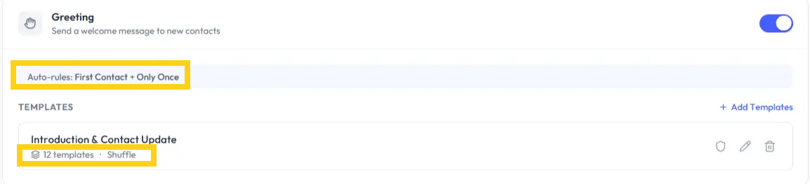 🔀 Example: The Intro & Contact Update Template Collection has 12 templates, which are sent at random to keep interactions varied and engaging 💬