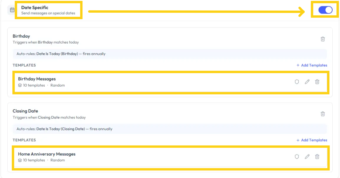 Both the Birthday and Closing Date Template Collections have 10 templates each, which are sent at random to keep messages fresh and engaging 💌