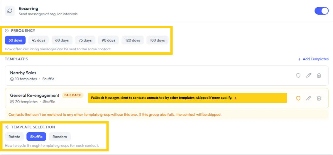 🎲 Select the Template Selection method — Random, Shuffle, or Rotate, which determines how templates cycle through each contact