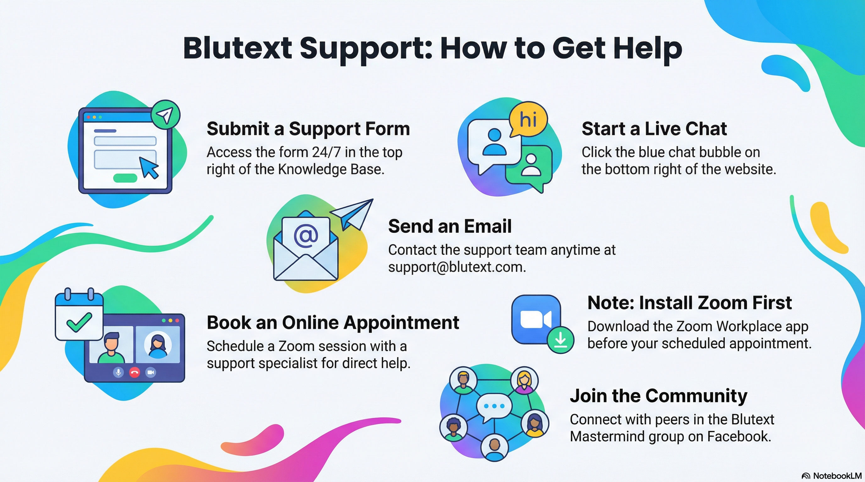 Here's how to get in touch with a Blutext Support person: Chat, email, online appointments, or submit a support ticket. Plus, join our Blutext Mastermind Facebook group!