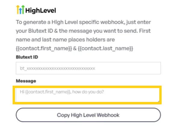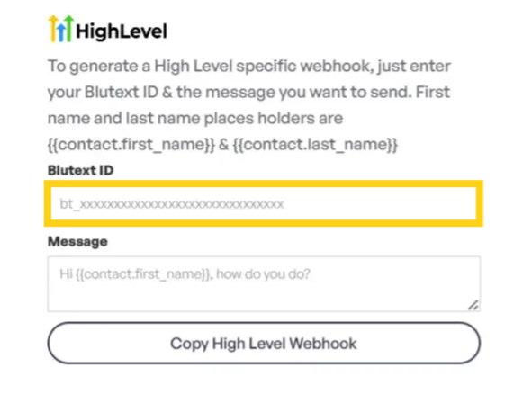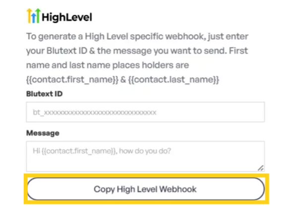 You can add High Level Merge Fields to the Blutext High Level Webhooks that you create on our Integrations page.