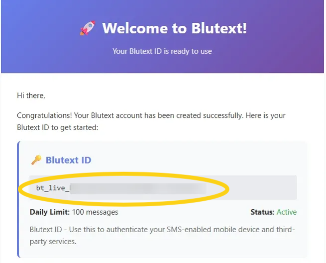 Go to your email, and locate the "Welcome to Blutext" email that we sent, open it, and copy the Blutext ID within.