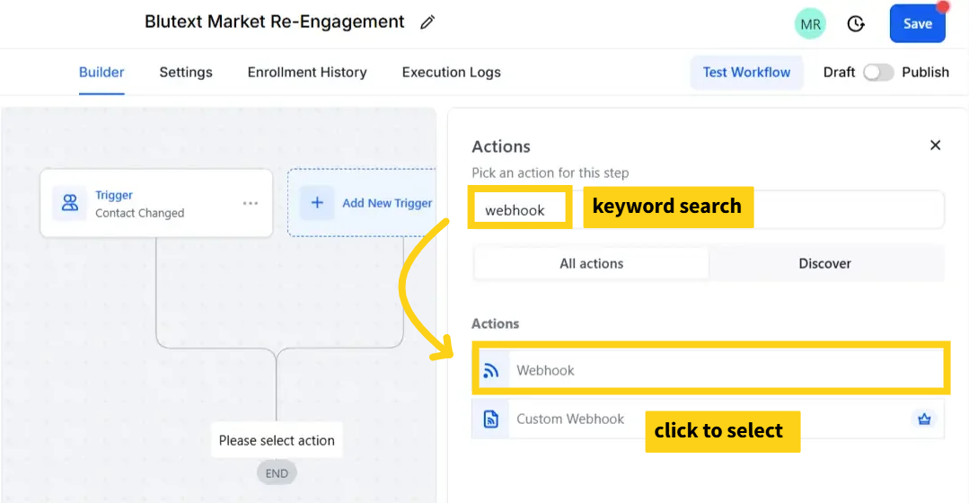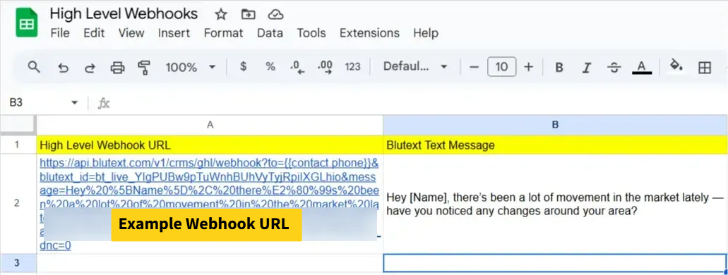 To save High Level Webhooks for Blutext, create a Google Sheet or Excel file with columns for the Webhook link and message details. This will help you track created Webhooks and easily copy the link for use in a High Level Workflow.