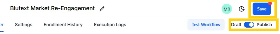 Continue creating your Workflow, click the toggle to "Publish" (to the right) and click the blue "Save" button at the top right of the page when complete. Once saved and published, you can assign it to a Contact in Automations.